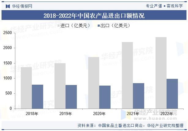 近年来,我国农产物商业总额呈上升趋向,特别农产物进口额上涨趋向更为显著。正在疫情影响最为严沉的2022年,农产物商业照旧连结快速增加态势。2022年,我国农产物进出口总额3343。2亿美元,同比增加9。9%,此中出口982。6亿美元,同比增加16。5%,占我国外贸出口总额2。7%;进口2360。6亿美元,同比增加7。4%,占我国外贸进口总额8。7%;商业逆差1378亿美元,比上年同期扩大1。7%。