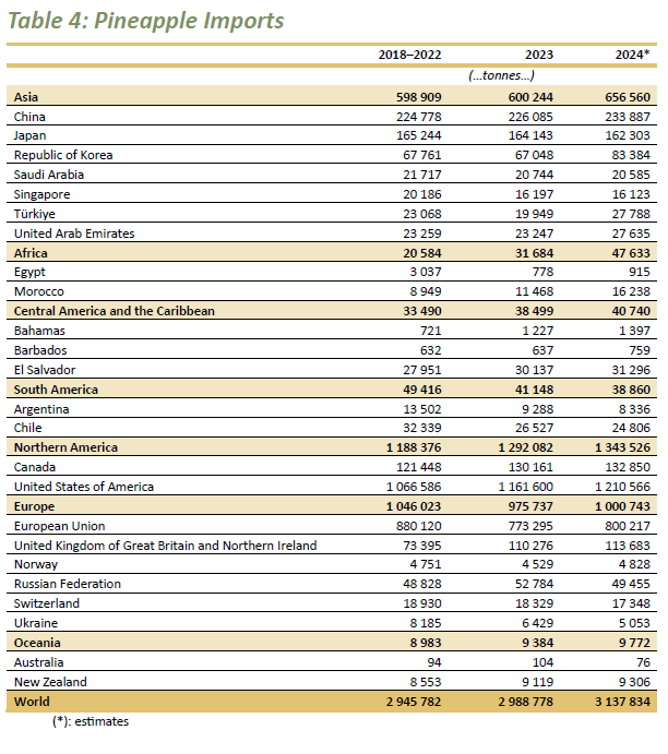 布景:次要依赖哥斯达黎加和墨西哥的供应,虽然墨西哥出口量下降,但哥斯达黎加的供应添加填补了缺口。美国市场:2024年1-11月,菠萝平均批发价钱较2023年同期上涨24%,价钱波动较大,1月为1。54美元/公斤,3月达到高峰2。46美元/公斤,随后正在7月和8月回升。2024年中国进口菠萝23。02万吨,价值2。04亿美元;此中菲律宾占进口额的97。7%,占进口量的97。29%,菲律宾是中国菠萝进口的最大来历国。价值0。24亿美元;此中吉尔吉斯斯坦占出口额的75。12%,占出口量的19。26%。吉尔吉斯斯坦和俄罗斯是中国菠萝出口的最大市场。