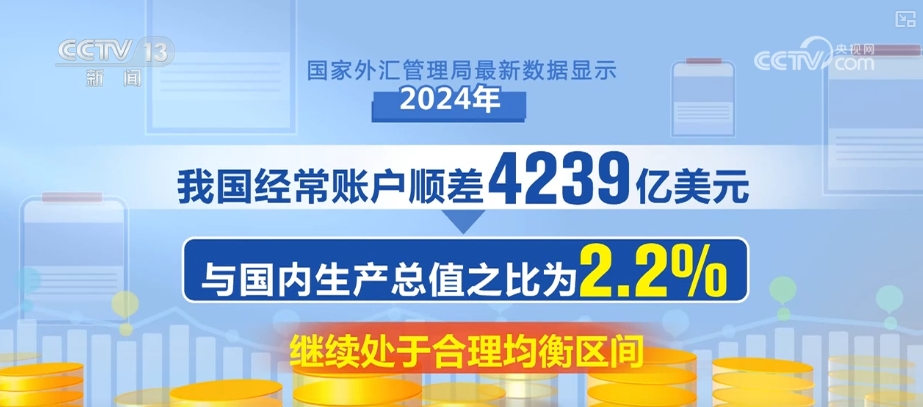 国度外汇办理局最新数据显示,2024年,我国经常账户顺差4239亿美元,取国内出产总值之比为2。2%,继续处于合理平衡区间。外商间接投资本钱金新增909亿美元,来华债券投资净流入468亿美元。2024岁暮,我国对外净资产为3。3万亿美元,增加15。6%。