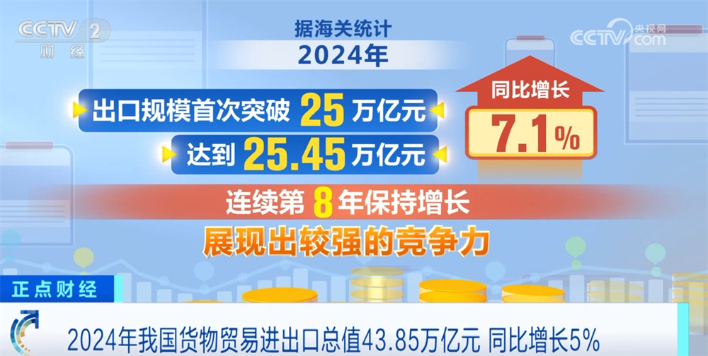 对外经贸大学中国世界商业组织研究院院长屠新泉称:“2024年我国外贸进出口成就亮眼,外贸总量、增量和质量都获得显著提拔。进出口商业额创出新高,全年实现商业顺差跨越1万亿美元。出格是这些成就是正在我国曾经具有40万亿庞大存量的根本上取得,实为难能宝贵。”正在13日上午国新办举行的旧事发布会上,海关总署副署长王令浚引见,2024年我国货色商业进出口总值43。85万亿元,总量、增量、质量“三量”齐升,规模再创汗青新高。2024年,我国货色商业进出口总值43。85万亿元,同比增加5%。此中,出口规模达到25。45万亿元,同比增加7。1%,持续第8年连结增加。进口18。39万亿元,同比增加2。3%。持续跨过42、43两个万亿级大关。从增量看,我国客岁外贸增加规模达到了2。1万亿元,相当于一个中等国度一年的外贸总量。目前看,我们的增速界次要经济体中也是较快的。”