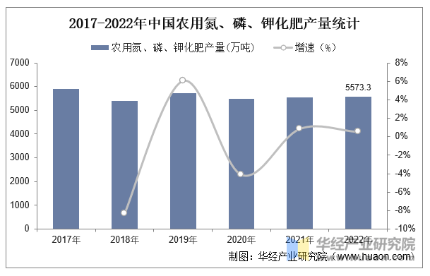 近年来,我国的农用氮、磷、钾化肥产量波动幅度较大。据统计,2022年的中国农用氮、磷、钾化肥产量为5573。3万吨,较上岁尾增加0。5%。