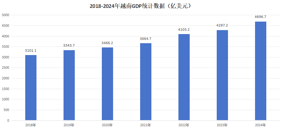 据越南打算取投资部统计总局2024年经济社会统计数据,越南2024年国内出产总值(P)同比增加7。09%,总量约4696。7亿美元,人均P为1。14亿越南盾(约合4700美元)