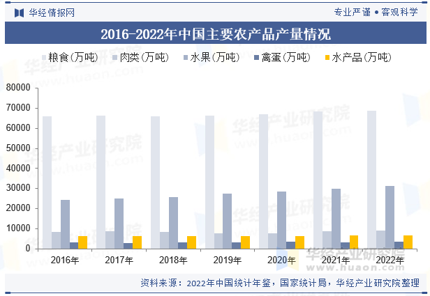 2022年,全国次要农区大部门时段光温水婚配优良,病虫害偏轻发生,景象形象前提总体有益于粮食做物发展发育和产量构成,但夏日长江流域高温干旱,东北地域南部农田渍涝灾祸偏沉,对粮食出产形成必然影响。按照国度统计年鉴的统计口径,2022年我国粮食实现减产丰收,达68652。7万吨,比上年添加368万吨,减产0。5%,粮食产量持续8年不变正在1。3万亿斤以上。肉类、生果、禽蛋、水产物产量别离为9328。4万吨、31296。2万吨、3456。4万吨、6865。91万吨。