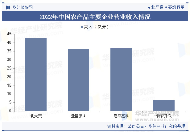 2022年,北大荒实现停业收入42。62亿元,同比增加17。42%;亚盛集团实现营收36。39亿元,同比增加9。19%;隆平高科实现停业收入36。89亿元,同比增加5。29%;新农开辟实现停业收入6。47亿元,同比削减5。53%。
