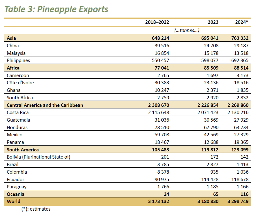 布景:次要依赖哥斯达黎加和墨西哥的供应,虽然墨西哥出口量下降,但哥斯达黎加的供应添加填补了缺口。美国市场:2024年1-11月,菠萝平均批发价钱较2023年同期上涨24%,价钱波动较大,1月为1。54美元/公斤,3月达到高峰2。46美元/公斤,随后正在7月和8月回升。2024年中国进口菠萝23。02万吨,价值2。04亿美元;此中菲律宾占进口额的97。7%,占进口量的97。29%,菲律宾是中国菠萝进口的最大来历国。价值0。24亿美元;此中吉尔吉斯斯坦占出口额的75。12%,占出口量的19。26%。吉尔吉斯斯坦和俄罗斯是中国菠萝出口的最大市场。